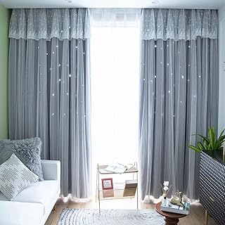 姫系カーテン レース 遮光 透かし彫り 星柄 二重カーテン 姫 おしゃれ かわいい インテリア 遮光率90% フリルつき 掃き出し窓 腰窓 出窓用 女子 可愛い 子供 寝室 客間 遮熱 断熱 アジャスターフック付き オーダー可能 OSONA(幅80CM*丈110CM *2枚入り 両開き グレー 透かし彫り)