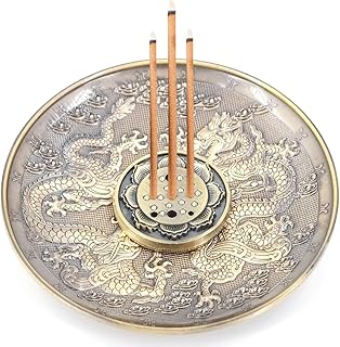 Amajiji お香スティックホルダー 真鍮香炉 レトロ彫刻パターン - アッシュキャッチャー付き スティック/コイル/コーン用香立て (ドラゴン)
