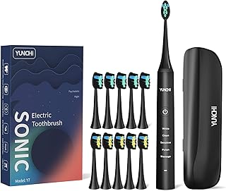 Yunchi Y7 電動歯ブラシ音波歯ブラシカスタマイズカラーシリーズ大人用ウルトラホワイトニング歯ブラシ、交換用ヘッド10個、収納ケース携帯便利、超音波モーター、スマートタイマー付きモード5個、30日間の使用で4時間充電-ソニックエレクトリック (Black)
